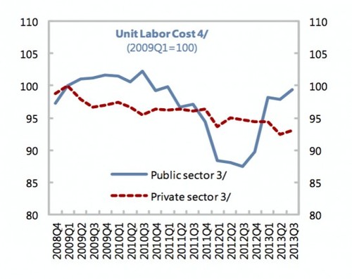 Contrariamente à ideia geral e muito principalmente à dos Juízes do Tribunal Constitucional, foi o sector privado que mais sofreu com a austeridade. Não foi o sector público. Existe entre os juízes do TC a convicção, vertida em diferentes acórdãos, de que a austeridade tem prejudicado especialmente os funcionários públicos, e que os cortes nos seus salários são injustos e desproporcionados. Estou certo que vão voltar a afirmá-lo no acórdão que está para sair. Por isso talvez lhes fizesse bem acrescentarem à sua biblioteca o relatório do FMI relativo à 11º avaliação, onde vem um gráfico muito curioso e elucidativo. É este: