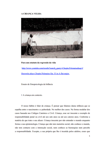 O nosso hábito é falar de criança. É pensar que falamos duma infância que se espalha entre o nascimento e a puberdade. No melhor dos casos. Na forma modelar dos casos baseada nos Códigos Canónico e Civil. Criança, esse ser inocente e exemplo de responsabilidade penal ou civil até aos sete anos ou até aos catorze anos. Conforme a matéria de que trate o seu afazer. Criança inocente por não entender o mundo enquanto forma a sua epistemologia. Criança que não tem memória social, não conhece o mundo, não tem contacto com a interacção social, nem conhece as hierarquias nem percebe a responsabilidade. Excepto, a sua própria que lhe é incutida pelos adultos, esses que detêm o chamado uso da razão. A criança pequena, objecto dos meus estudos entre os Portugueses, Galegos e o clã Picunche da Nação Mapuche do Chile, que brinca e corre, inventa jogos, cresce e cruza pelos ciclos de vida até ser um adulto com todos os desejos e a responsabilidade aprendida enquanto desenvolve o seu julgamento aprendido no brincar e na escola, na interacção com a meninada da rua, da casa ou do pátio. É o seu contexto social que lhe ensina a memória social, essencial para o convívio entre os seus e o mundo que lhe cabe viver ao longo do tempo.