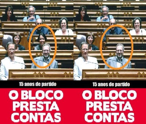 Apaga Ana Drago como se pode ver na foto abaixo. Como sempre fizeram os Estalinistas quando tiravam das fotografias os elementos caídos em desgraça e os mandavam para a Sibéria ou para os campos de trabalhos forçados. Porque é que desapareceu a Ana Drago se ela é a mais bonita deles todos e das mais inteligentes? Ajustar contas!