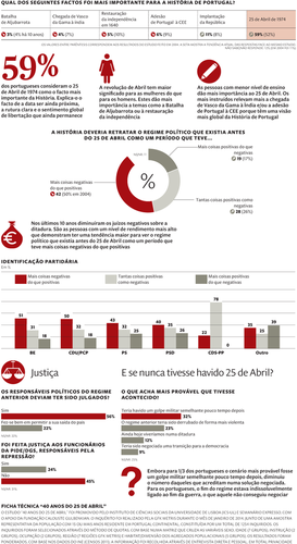 Que não hajam dúvidas nem tentações. O povo português rejeita absolutamente o Estado Novo que caiu com o golpe de 25 de Abril de 1974. E viva o 25 de Abril! Se alguma coisa resulta deste estudo, feito pela segunda vez em dez anos (houve um outro em 2004), é isso mesmo: os portugueses rejeitam o passado ditatorial e consideram o 25 de Abril o acontecimento mais importante da sua História, entre todos os outros.