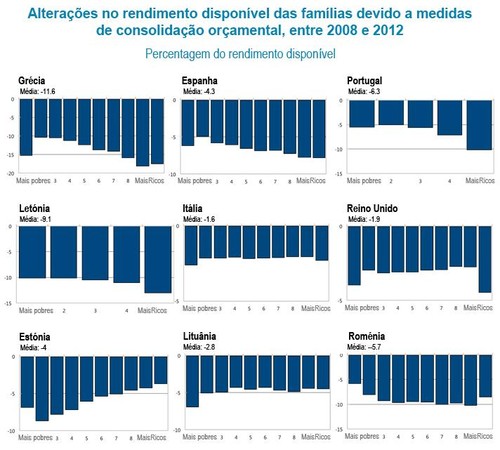 Portugal foi o país onde os cortes foram maiores para os ricos. Entre 2008 e 2012, os portugueses perderam, em média, 6,3% do rendimento disponível (depois de impostos) devido às medidas de consolidação orçamental. O grupo onde se encaixam os 20% de portugueses mais pobres perdeu cerca de 5% do seu rendimento disponível (o valor da queda é semelhante para 60% da população portuguesa), enquanto os 20% mais ricos perderam um pouco mais de 10% nestes mesmos quatro anos.