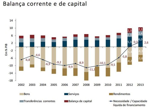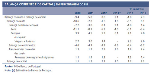 No primeiro semestre de 2013, a capacidade de financiamento da economia portuguesa, medida pelo saldo conjunto das balanças corrente e de capital, aumentou para 2,3% do PIB.